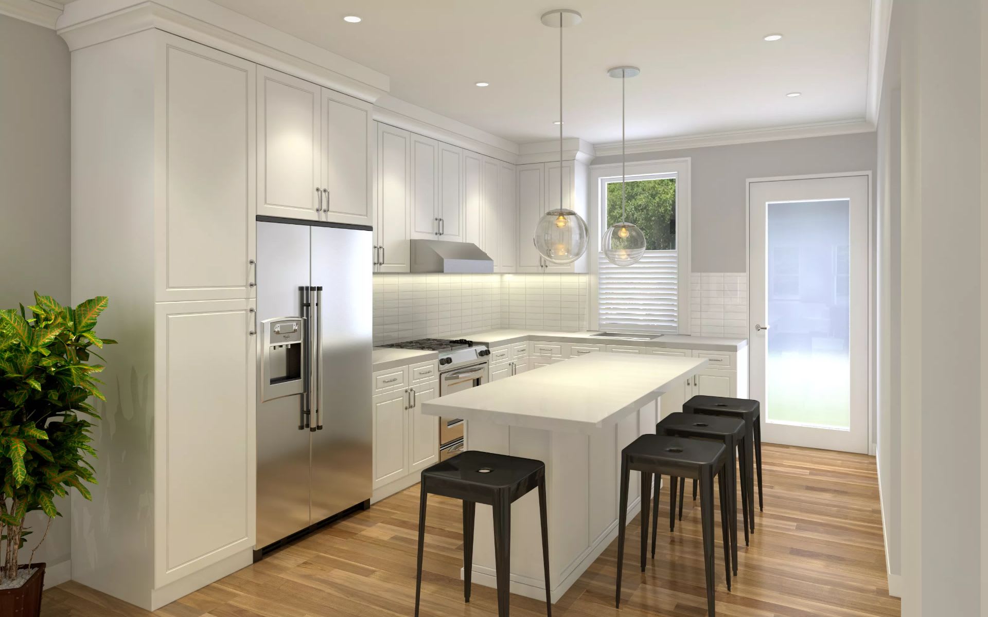 - Bosch stainless appliances, shaker cabinets, and quartz counters
