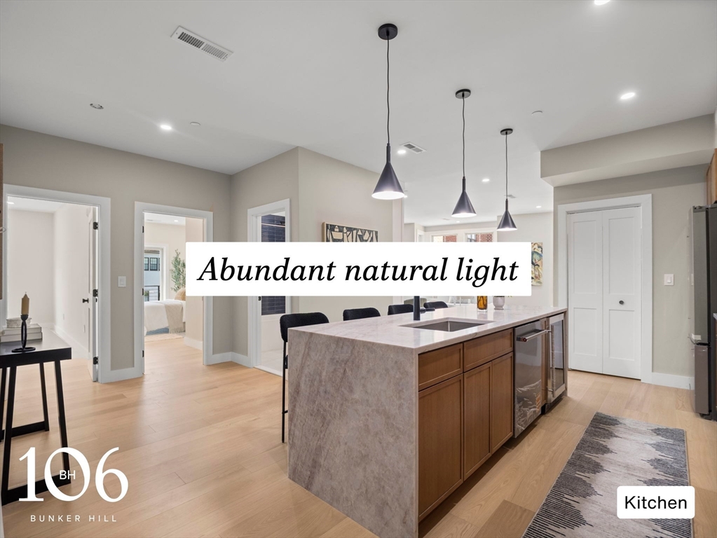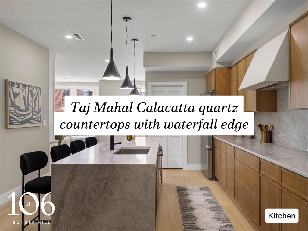 Experience modern luxury in this newly constructed 6-unit boutique building in the heart of Charlestown. This spacious 3-bed, 2-bath condo offers an open-concept layout anchored by a chef's kitchen with a waterfall island, full stainless steel appliance suite, and wine fridge--ideal for entertaining. Each bedroom is generously sized with custom closets, while a private deck features sweeping views of the Bunker Hill Monument. The primary suite serves as a serene retreat with a spa-like bath including radiant heated floors, a bidet, custom glass shower, heated backlit mirror, and linen closet. Superior sound insulation ensures quiet comfort. Additional highlights include a deeded 10x10 lower-level storage room and an uncovered parking space just steps from the building--a rare Charlestown offering. With the option to select your own paint colors, this exceptional home is ready to be personalized. *2-1 buy-down program offered by CrossCountry Mortgage; available for full-price offers only