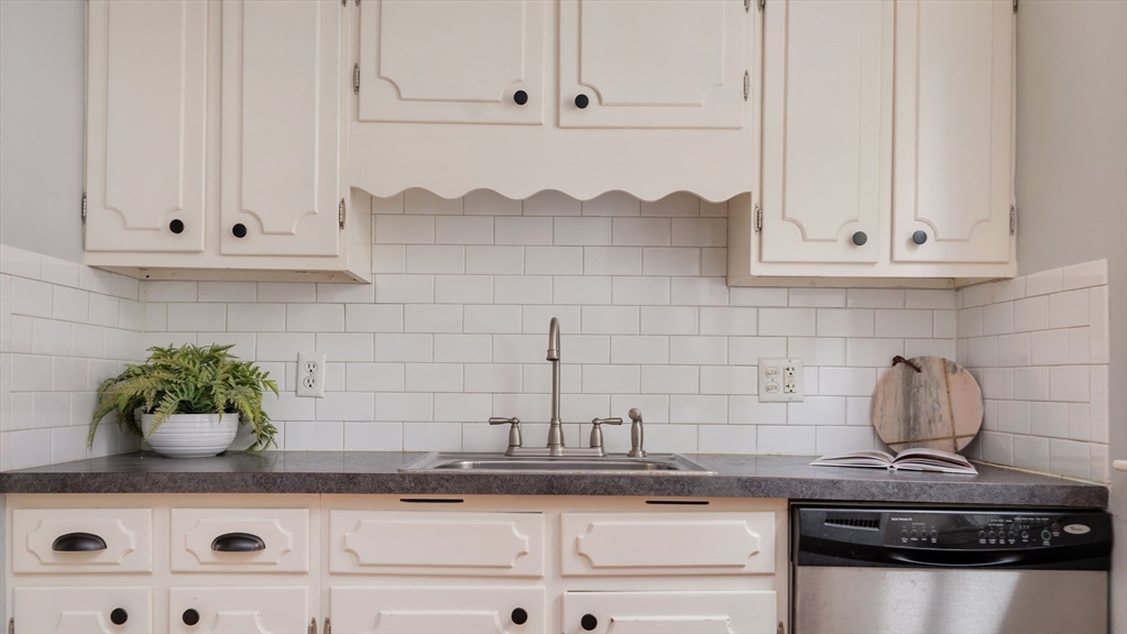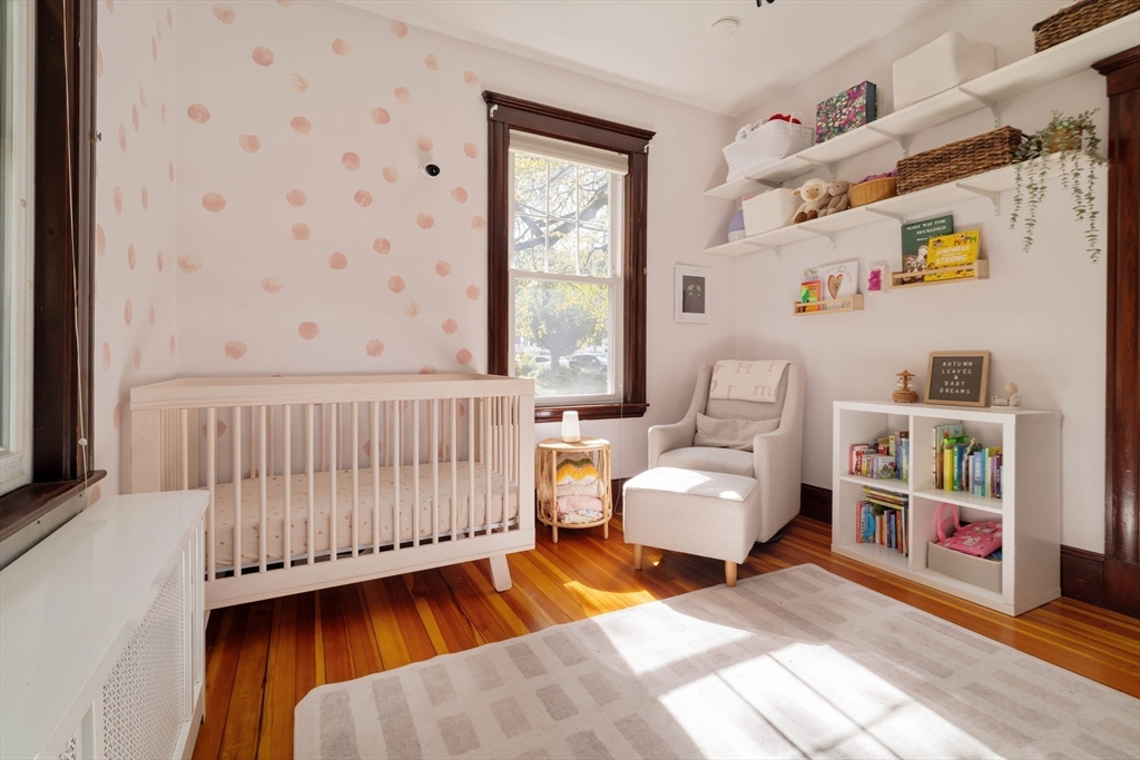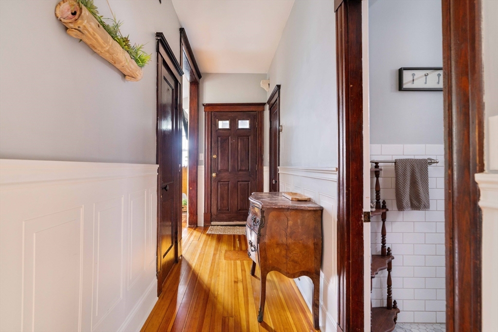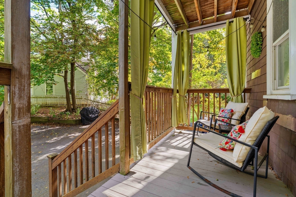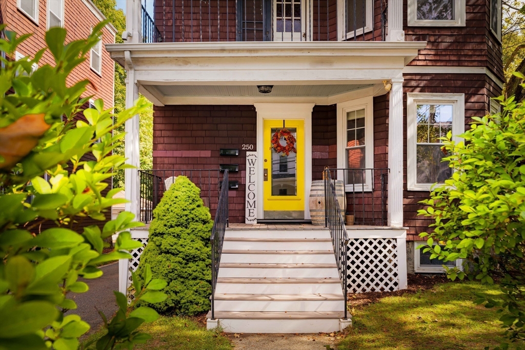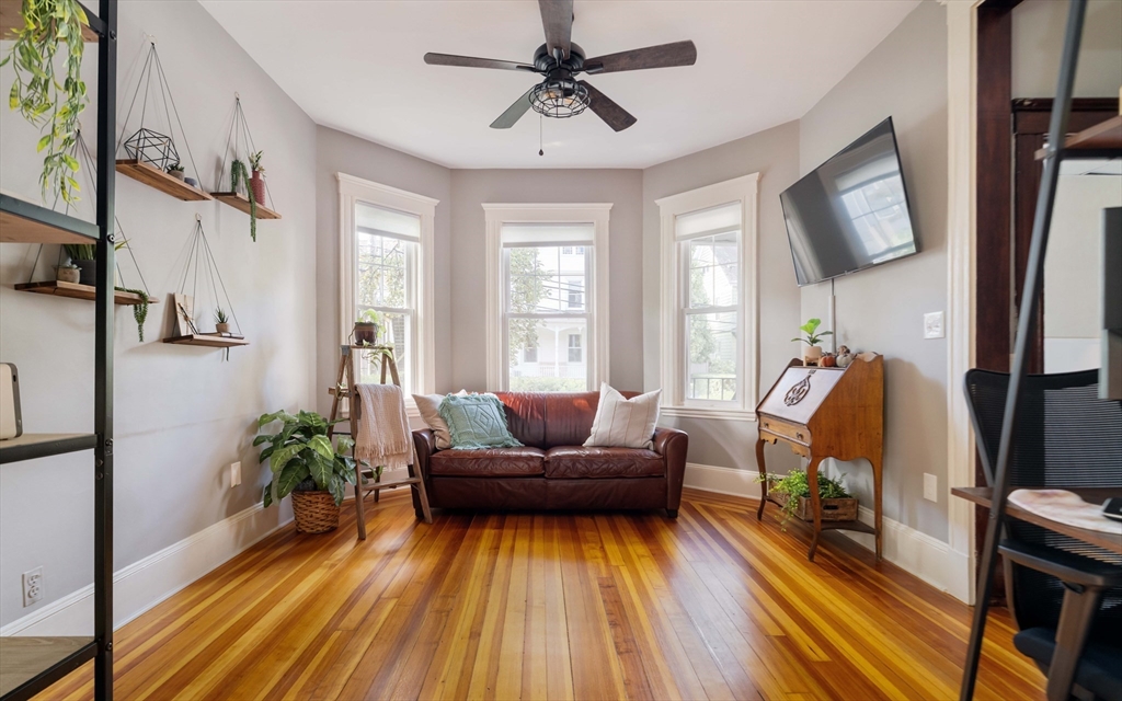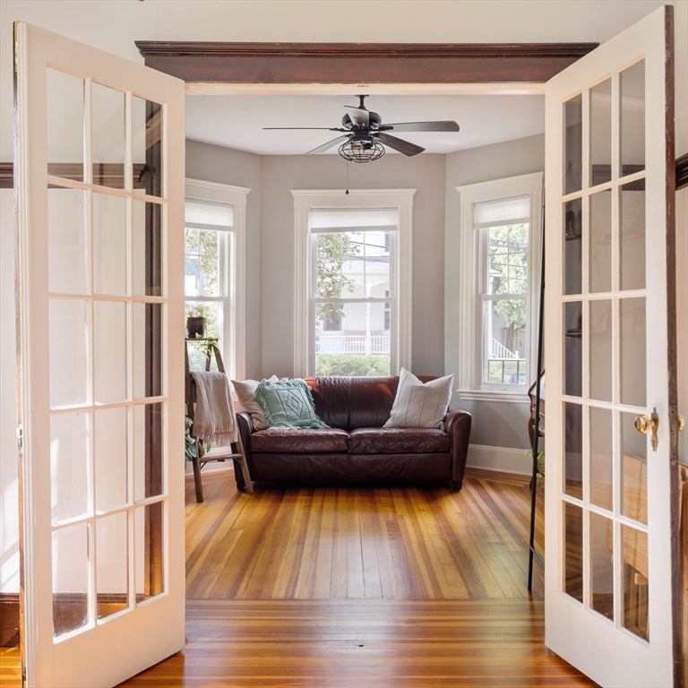 Tucked away on a private, set-back lot, this 2-bedroom, 2-bath condo awaits its next owner. The layout is thoughtful: a central hallway connects inviting living and dining rooms to an oversized, eat-in gas-range kitchen. Two well-proportioned bedrooms are separated by the kitchen, each with quick access to a full bathroom for convenience and privacy. Period charm shines with high ceilings, original pine floors, rich wood trim. Large bay windows elevate the living spaces. The classic built-in china hutch and French doors honor this home's 1900 legacy, while the two renovated bathrooms and in-unit laundry provide modern comforts. Outside, a private rear porch opens to off-street parking and a lush "secret garden," perfect for family barbecues or relaxing with your morning tea. Don't miss the large basement storage unit or two side-by-side, off-street parking spaces. Just a half mile to Roslindale Village for shopping, dining, and commuting!