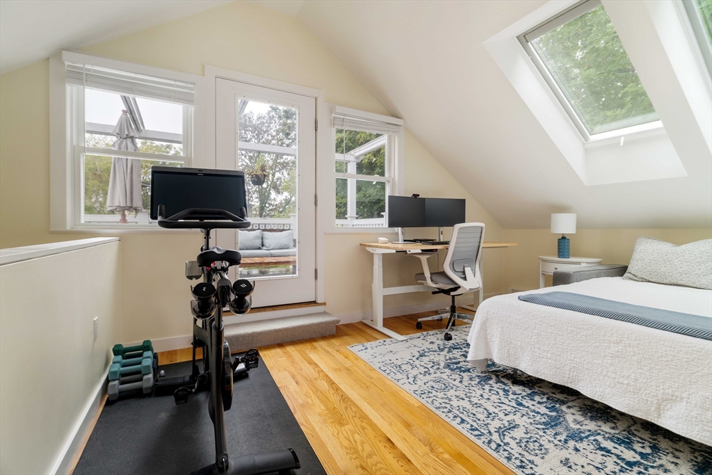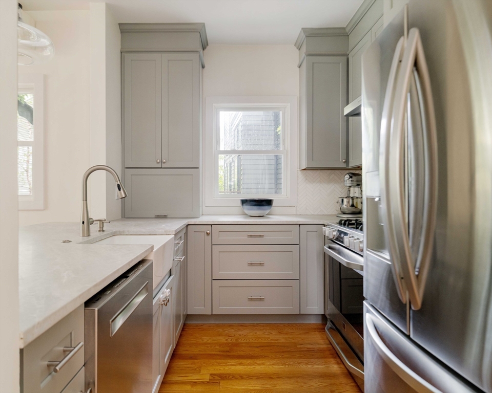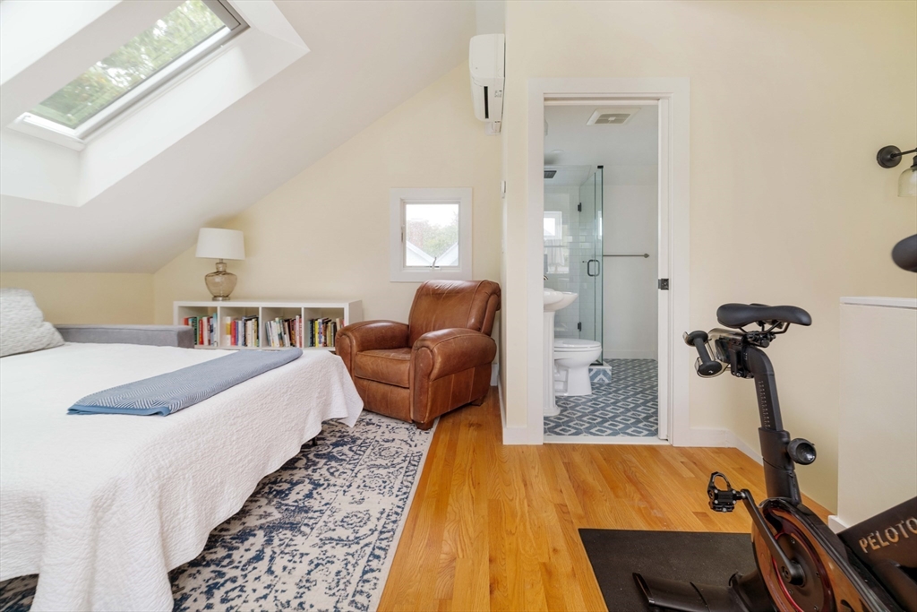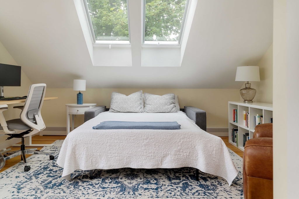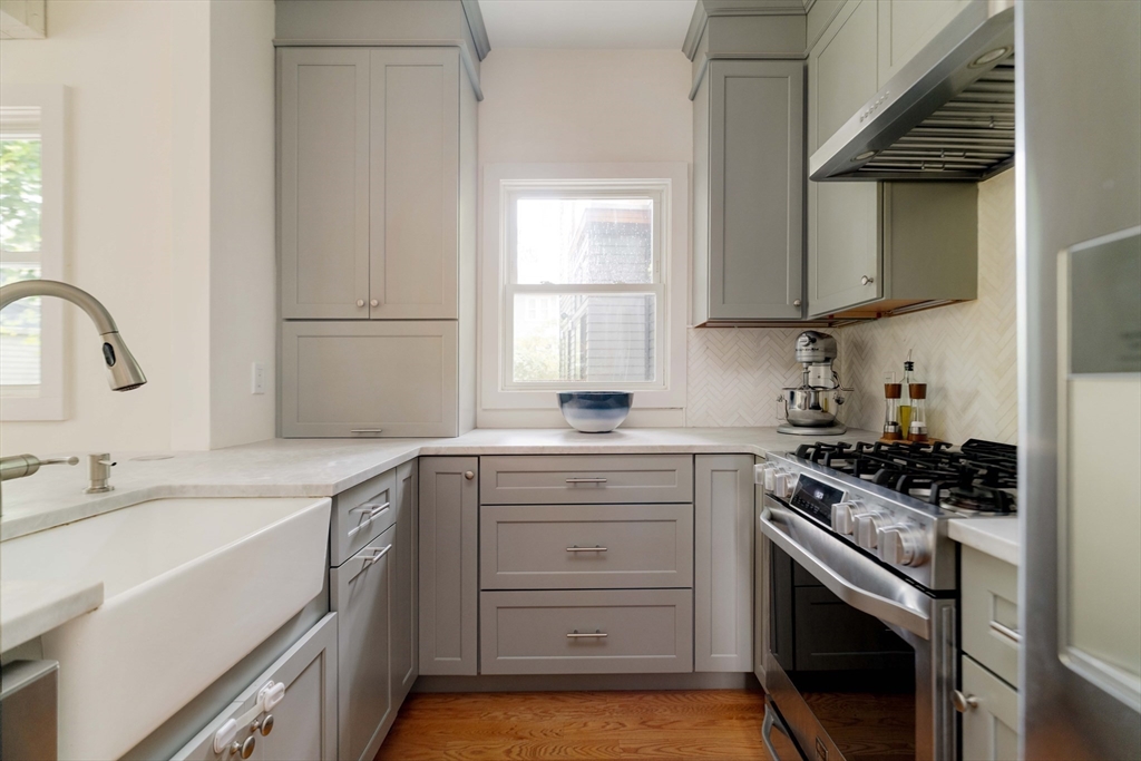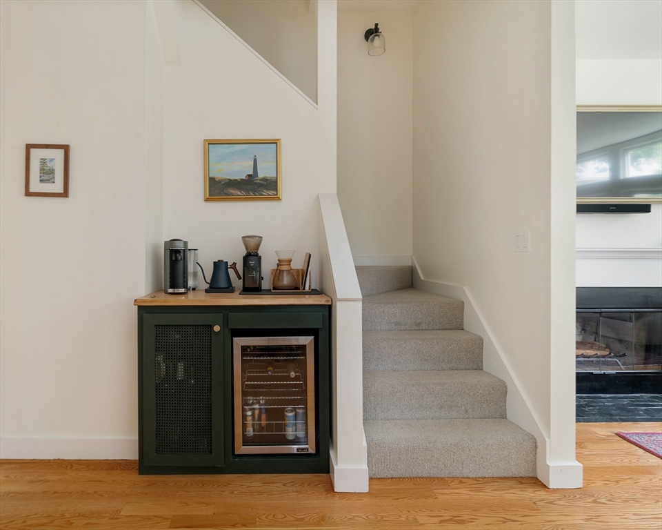 Experience modern elegance in this beautifully renovated 3-level Cambridge condo that lives like a single-family home! Thoughtfully updated in 2022, this 1,371 sq ft residence features a sleek kitchen, chic half bath, new hardwood floors, a wood-burning fireplace, oversized windows with tranquil tree views, and direct access to a private fenced-in backyard. Upstairs offers 2 bedrooms and a full bath with in-unit laundry. The top level adds a versatile 3rd bedroom or office/studio with cathedral ceilings, skylights, a brand new full bath, and a coveted private roof deck. Additional perks include mini-splits for central cooling and supplemental heating, garage parking, and extra storage. Ideally located near Kendall, Central, Inman, and Union Squares, this home blends modern comfort with the vibrant charm of Cambridge living.