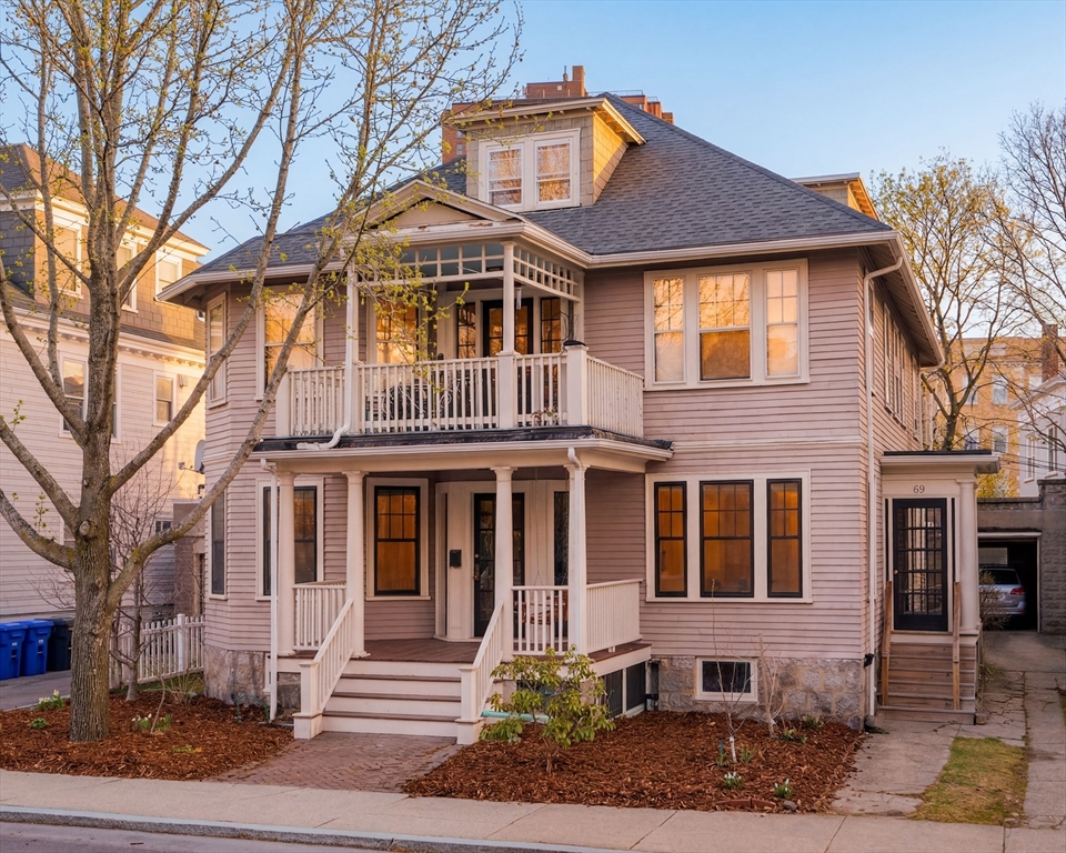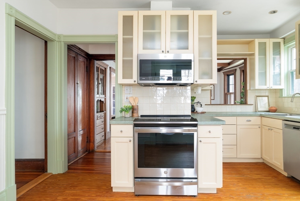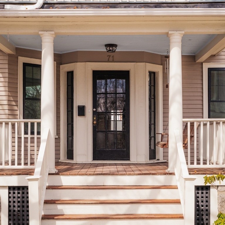 Enjoy mornings on a porch swing beneath classic columns as Pondside stirs. A private entrance opens to a bright vestibule w/ sidelight windows. Fir & Oak underfoot, the grand entry hall unfolds; a room of its own, w/ antique decorative fireplace. Wide, framed doorways open the front rooms, antique touches made modern- coffered ceilings & freshly painted walls, wood shutters & new Harvey windows, a lovely leaded glass front cabinet beautifully kept. A pass through window frames the kitchen, where wood floors & retro counters anchor nostalgia, elevated by a new GE profile microwave & slide-in convection range. French doors lead to a private porch--dining outside, tending a garden, or simply enjoying fresh air. Among the 3 bedrooms, a full tiled bath w/ antique clawfoot tub & floating vanity, serviced by a linen closet. Basement provides excl. laundry, ample storage & walk-out door. One of JP's dream streets, close to the Pond & Centre St, Whole Foods, Longwood + Green (E) or Orange line.